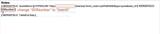 - Then highlight "Pay by PencilPay" again and right click on your mouse -> select "Toggle field codes" and change "SONumber" to "SaleID". Then click "Update Field" and then "Toggle Field Codes" to check the "SONumber" is showing as "SaleID".