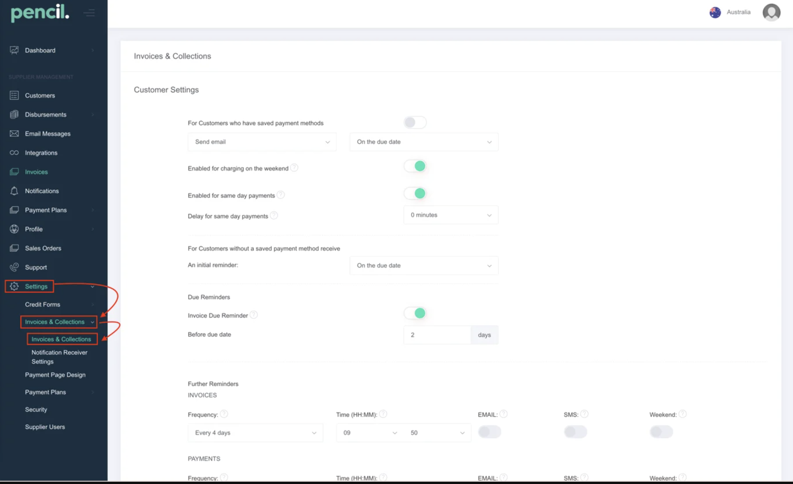 In Pencil, go to Settings → Invoice & Collections → Invoice & Collections