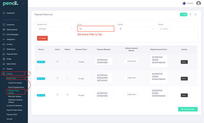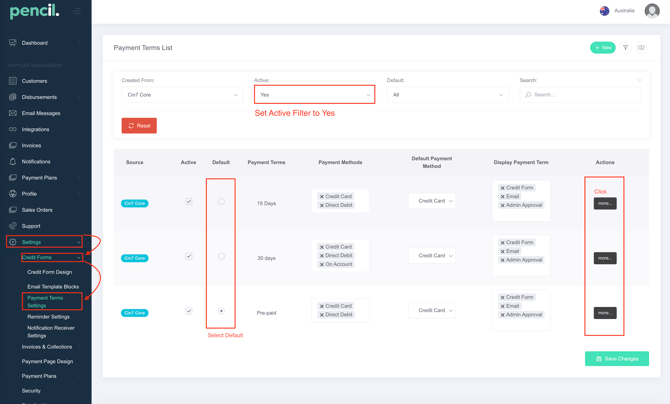 In Pencil, go to Settings → Credit Forms → Payment Terms Settings