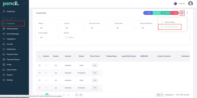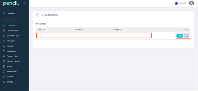 In Pencil, go to Customers → On the upper-right hand corner of the page, click on the three dots (...) → Review Duplicates → You will find the option to "Merge" or "Skip" the customer records