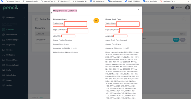 This article explains how to use the Review Duplicates tool in PencilPay to identify and merge duplicate customer records. Merging duplicates keeps your customer list clean and ensures all applications and invoices stay linked to the correct account. From this screen, you can choose to Merge or Skip each pair of customer records.