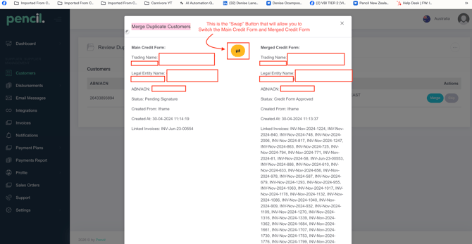 There is also a button called the "Swap Main Credit Form" button which will allow you to Switch the Main Credit Form from the Secondary Credit Form you wish to Merge.