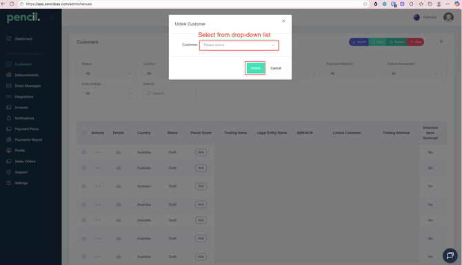 After clicking on the "Unlink Customer" feature, a pop-up will come upwhere you can select the correct contact to unlink from the drop-down list. Click on Unlink to proceed.