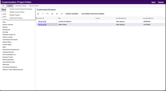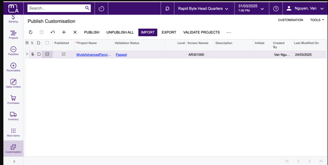 Click on the project name of the newly uploaded customisation at step 1.b.iii