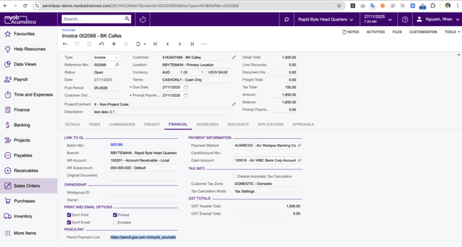 Pencil payment link configuration guide for Sale Invoices in MYOB Acumatica
