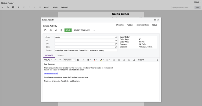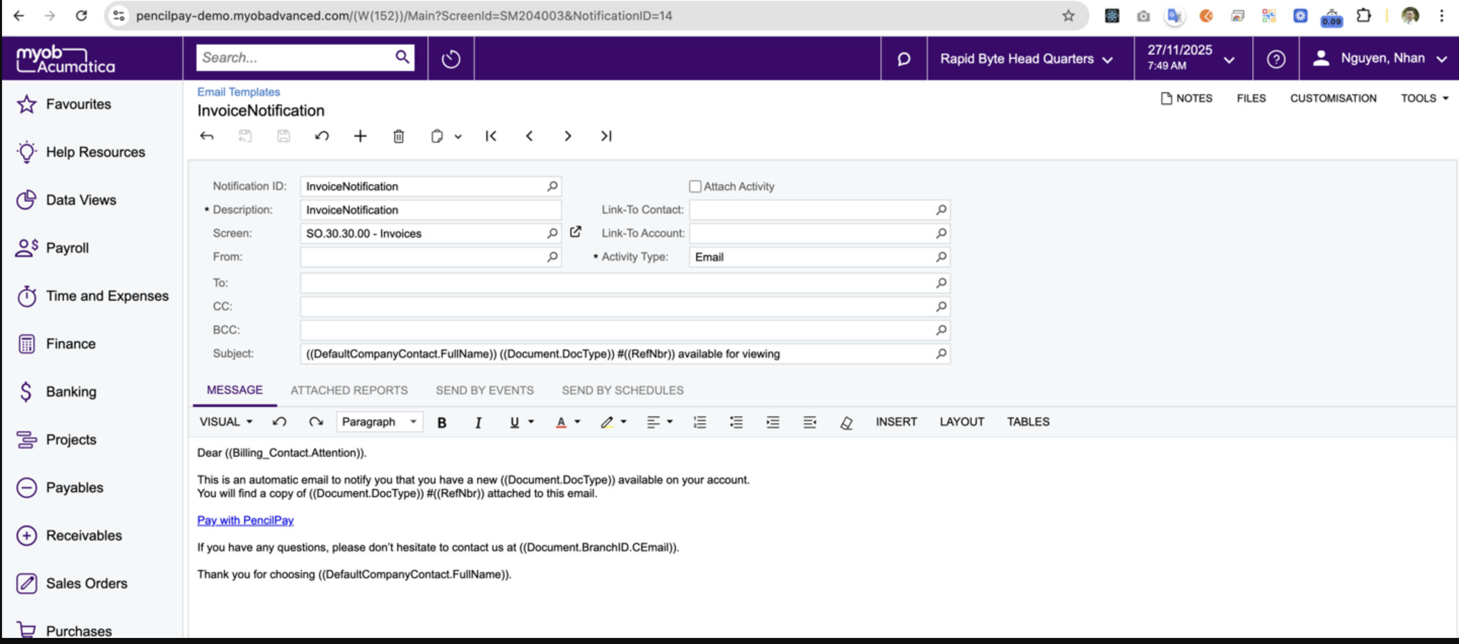 Guide to adding PencilPay payment link to MYOB Acumatica sales invoices and email templates so customers can pay using the Pencil Payment link.